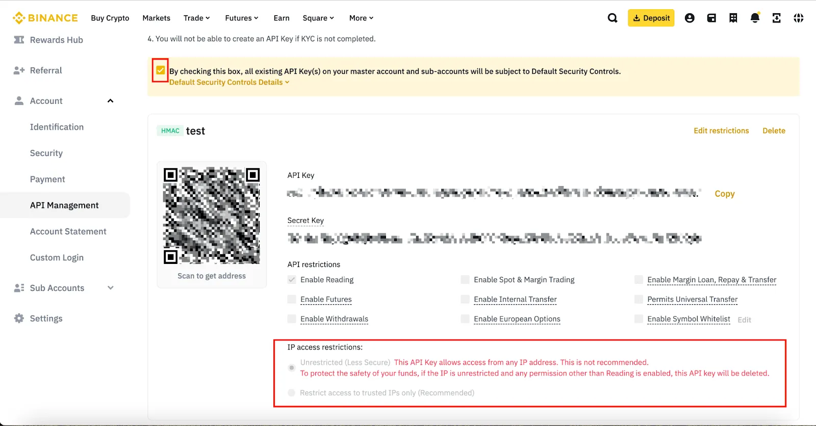 Restricción de IP obligatoria: Binance no permite el funcionamiento de bots P2P si la API Key no tiene una IP restringida. Asegurate de colocar la IP que te proporcionamos en el dashboard, de lo contrario el bot no podrá conectarse.